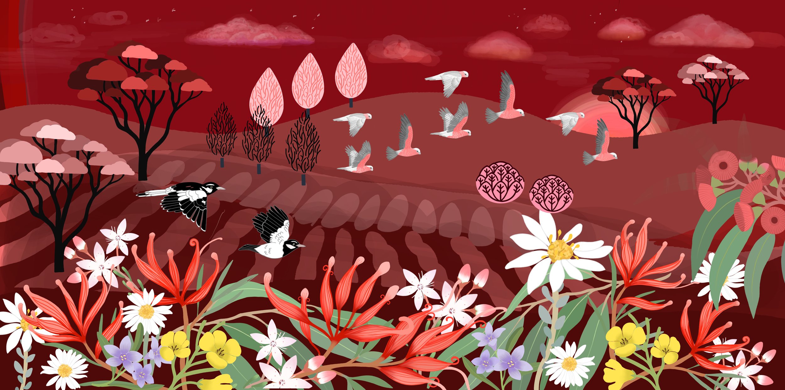 The initial concept was to create several motifs for each wine variety that could be used as a repeated pattern. The background colour for each wine was to remain consistent with their usual packaging to make it easy for customers picking up their favourite so this also got me thinking about colours of native flowers and birds that might either contrast or enhance these backgrounds.