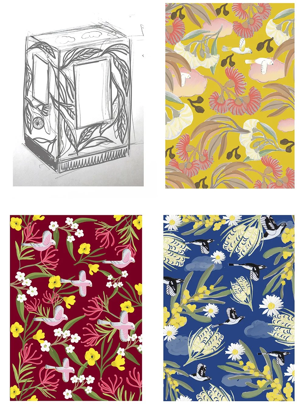 I was really happy to take the project in either direction. I confess that I did think the pattern might be the easier option but when Winesmiths made the decision to choose the landscape idea, I was equally excited to imagine what the final boxes might look like. I was also given a list of native flora in the area where the grapes are grown and I began making some sketches of native birds as well.